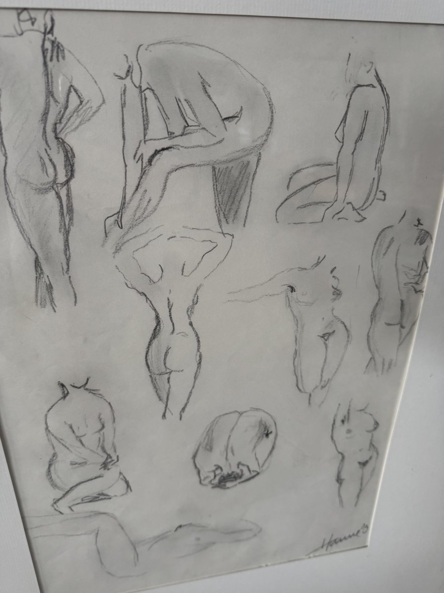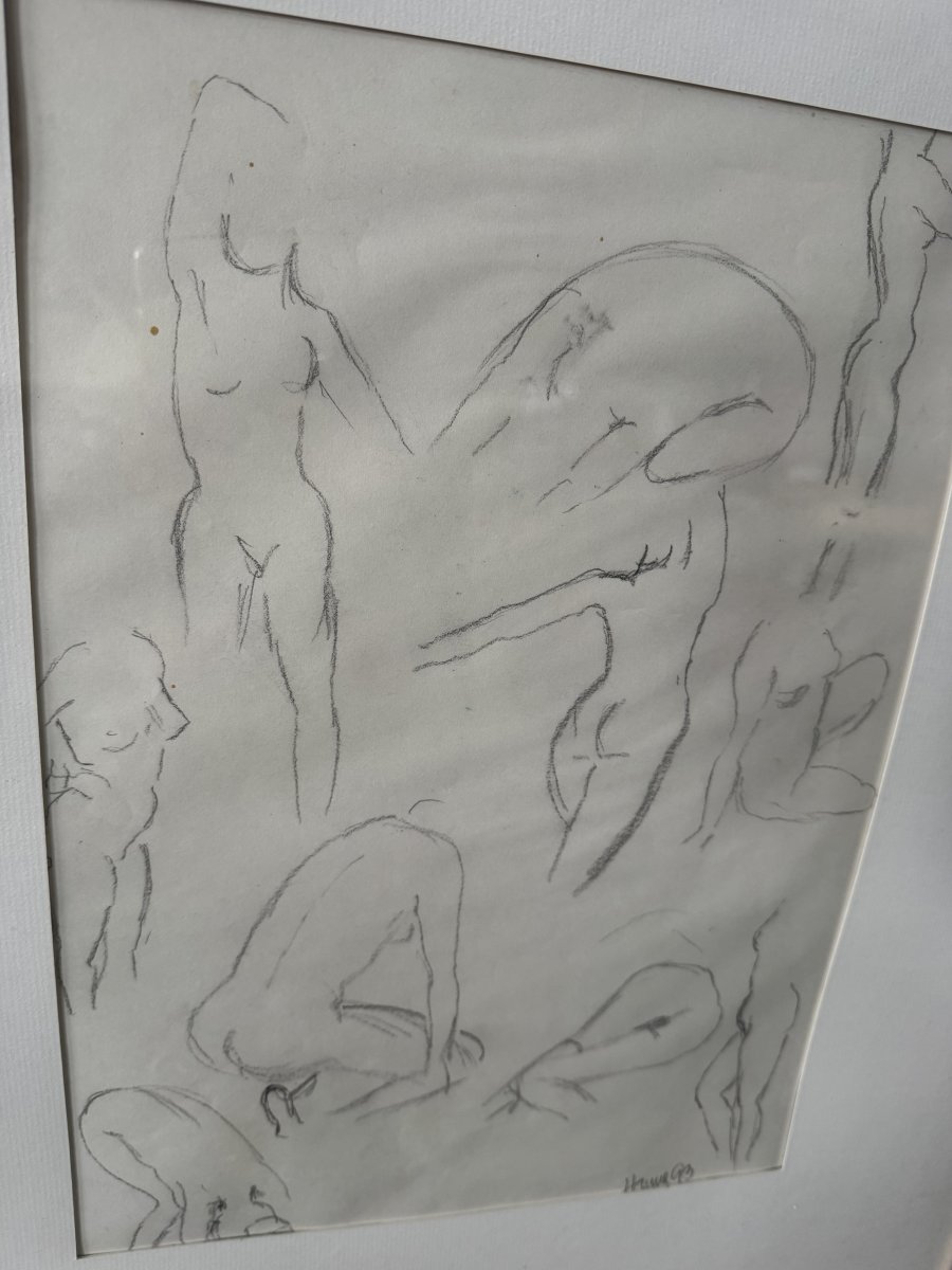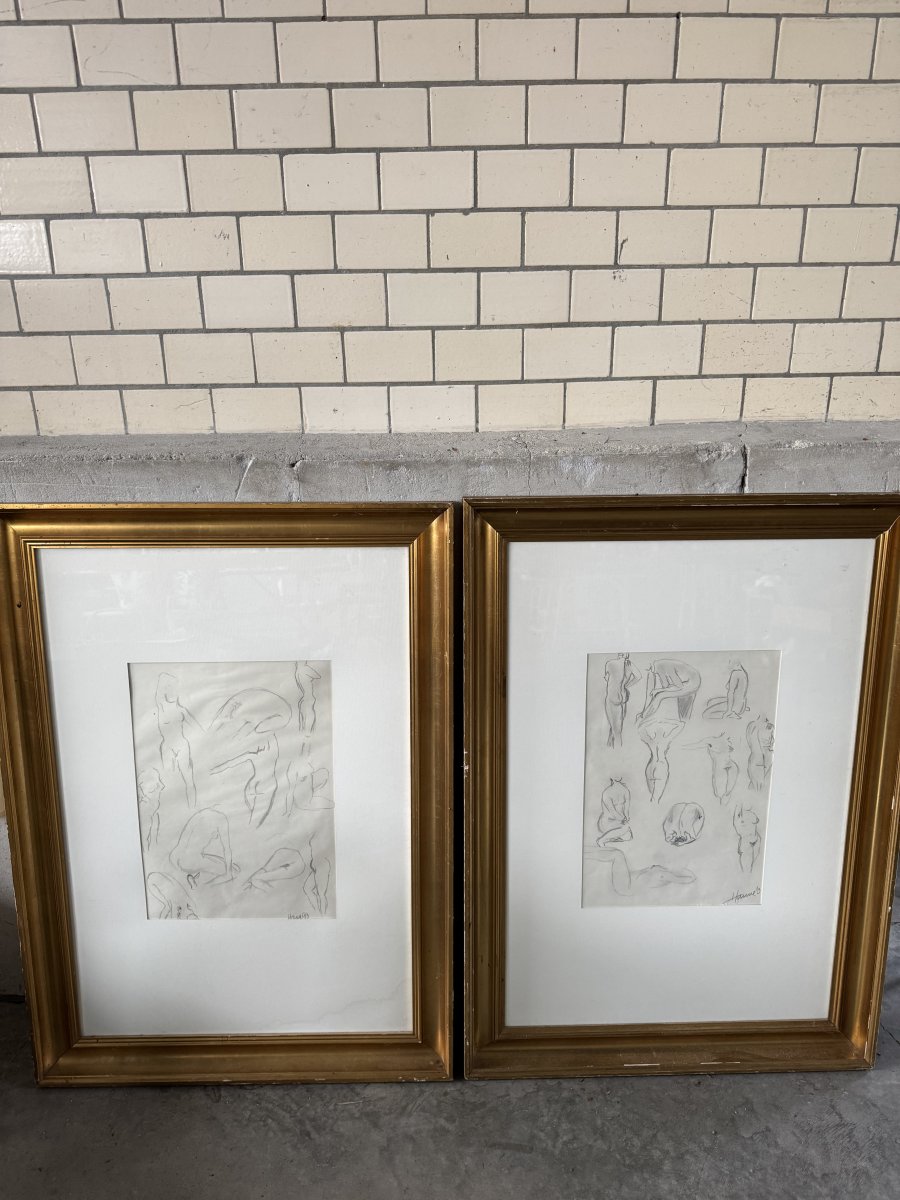 Guld ramme med originale croquis tegninger, ialt 2 stk.